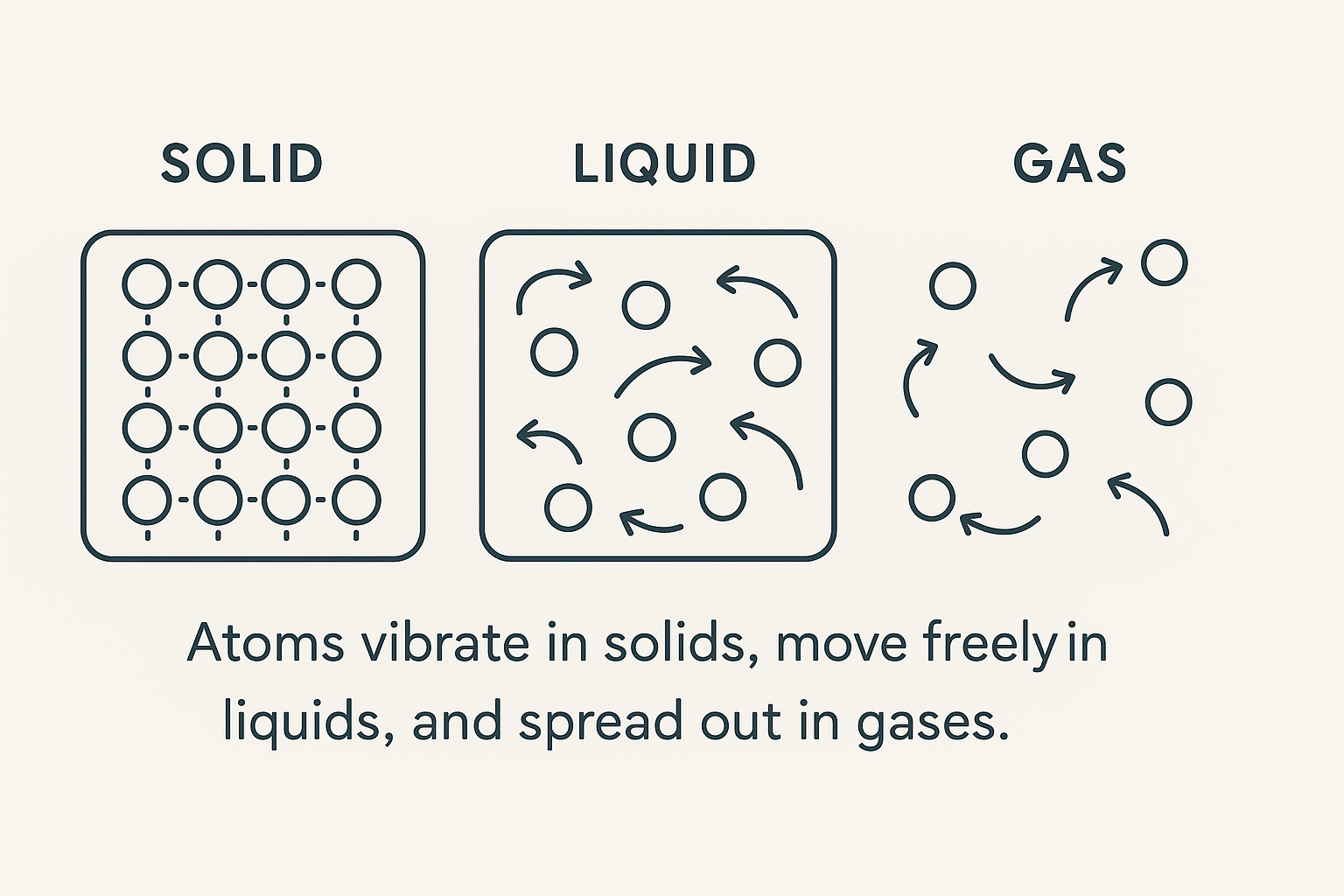 Kinetic vs. Potential Energy in Matter : In any state of matter, particles have both kinetic energy and potential energy. Kinetic energy comes from the motion of the particles—whether they are vibrating in place, sliding past each other, or moving freely in all directions. Potential energy, on the other hand, is stored in the interactions and bonds between particles. In solids, particles are tightly bound, so potential energy dominates while kinetic energy is smaller. In liquids, the balance shifts, with particles moving more freely but still held together by weaker forces. In gases, particles are far apart and moving very fast, so kinetic energy is much greater while potential energy is minimal.