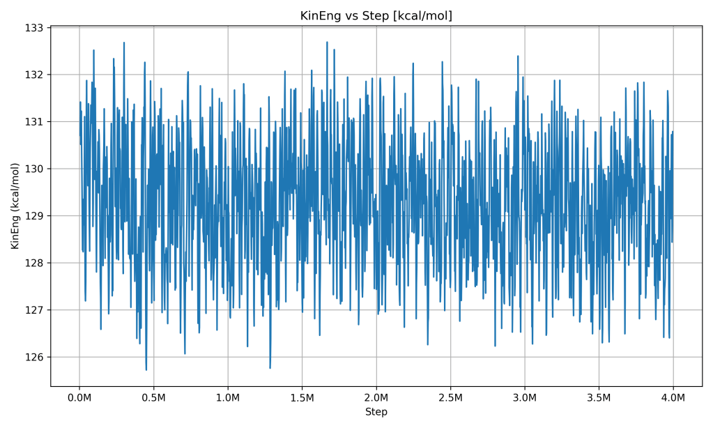 Kinetic Energy vs Simulation Step. The kinetic energy graph (which reflects the energy of motion of the particles) mirrors the behavior of the temperature graph. After a short initial adjustment, the kinetic energy stays around a constant level with only small fluctuations. This makes sense because at a steady temperature, the average kinetic energy of the molecules should remain stable (temperature is a measure of the average kinetic energy of particles).