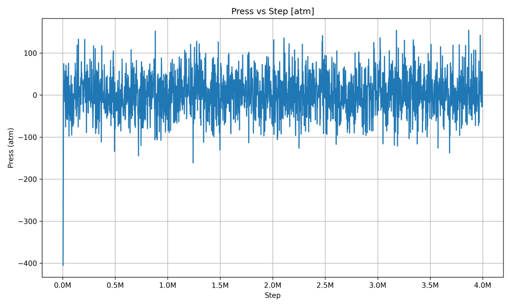What it indicates: The system’s pressure became balanced and stable on average. Those remaining ripples in the graph are due to molecules constantly moving and bumping around (which is normal), but importantly, there’s no drift upward or downward in pressure over time. This means the PCM isn’t expanding uncontrollably or building up pressure – it reached an equilibrium with its surroundings. In a real thermal battery, stable pressure is important for safety and consistency, and here the simulation shows the PCM maintaining that stability after the initial settling period.