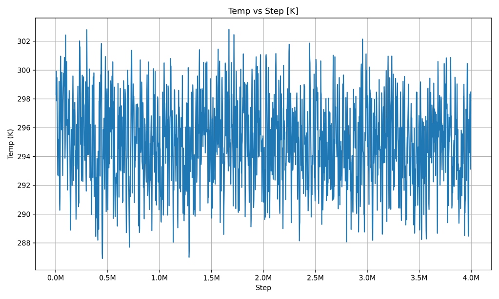 The temperature of the system stays very close to a constant value (around 298 K, which is roughly 25 °C, about room temperature) throughout the simulation. In the graph, after a brief settling phase, the temperature line hovers around this value with only minor wiggles. Those small fluctuations (a few degrees at most) are normal random variations as atoms move, but there’s no overall increase or decrease in temperature over time.