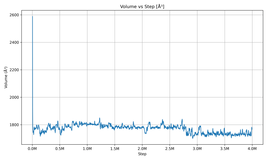 Volume vs Simulation Step. The volume of the simulated PCM (the size of the simulation box) changed noticeably at the start and then leveled off. The graph shows the volume dropping quickly in the early steps (meaning the material contracted or the simulation box shrank) and then fluctuating slightly around a stable value thereafter. What it indicates: The PCM adjusted its density and then reached a stable size. Early on, the large volume change likely came from the PCM sample finding a more compact, stable structure (for instance, if there were gaps or an expanded arrangement initially, the material pulled together once it equilibrated, which would reduce volume and increase pressure to normal levels). After that, the volume stayed roughly constant, showing that the material isn’t expanding or contracting anymore. This stability in volume goes hand-in-hand with stable pressure and temperature – all are balanced. In practical terms, a thermal battery material that doesn’t keep changing size once settled is important (to avoid stressing the container). The simulation indicates that after the PCM’s phase adjustment, its volume remains steady, meaning the system has structural stability at the operating temperature and pressure
